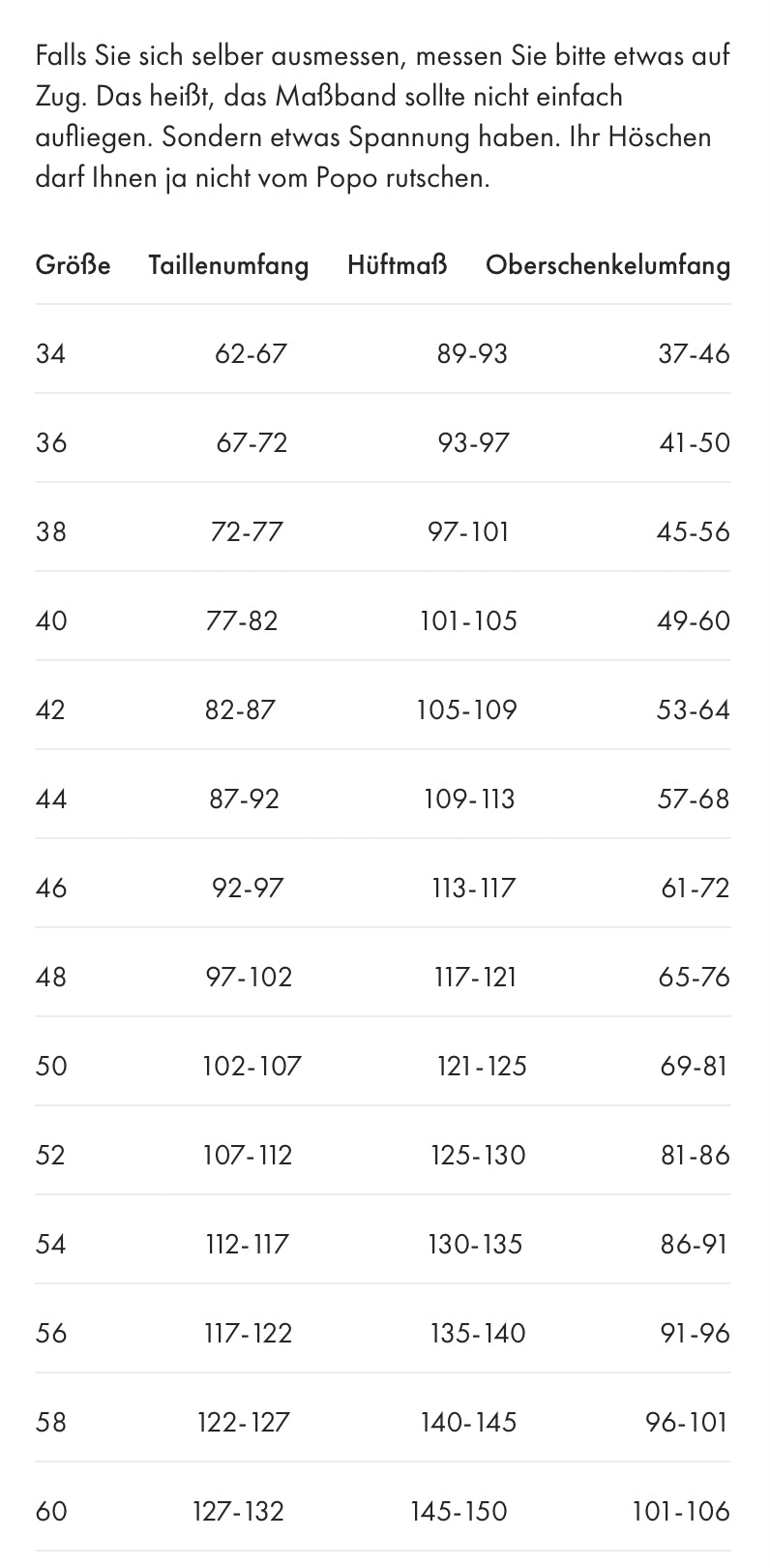 Wichtig! Die Wunderhose muss angenehm sitzen. Bei dieser Hose geht es nicht um den maximalen Druck. Die so geschätzten Wunder Wirkweisen erarbeiten die innenliegend, aktiv arbeitenden Noppen. Und diese brauchen Raum, um die Wirkweisen erarbeiten zu können. Extrem wichtig ist die gute Passform, zur Sicherheit am besten einmal selbst ausmessen! Bitte beachte die Größentabelle) Du brauchst 3 Umfänge: 1. Taille - Höhe Bauchnabel 2. Hüfte - Höhe Beckenknochen (Unterbauch) 3. Stärkste Stelle Oberschenkel. Bitte immer etwas auf Zug messen. Solltest Du zwischen 2 Größen liegen, bestelle bitte die größere Größe. bei Unsicherheit nicht zögern und Vera Meyer über What’s App +49175 4752517 oder per Email kontaktieren.
