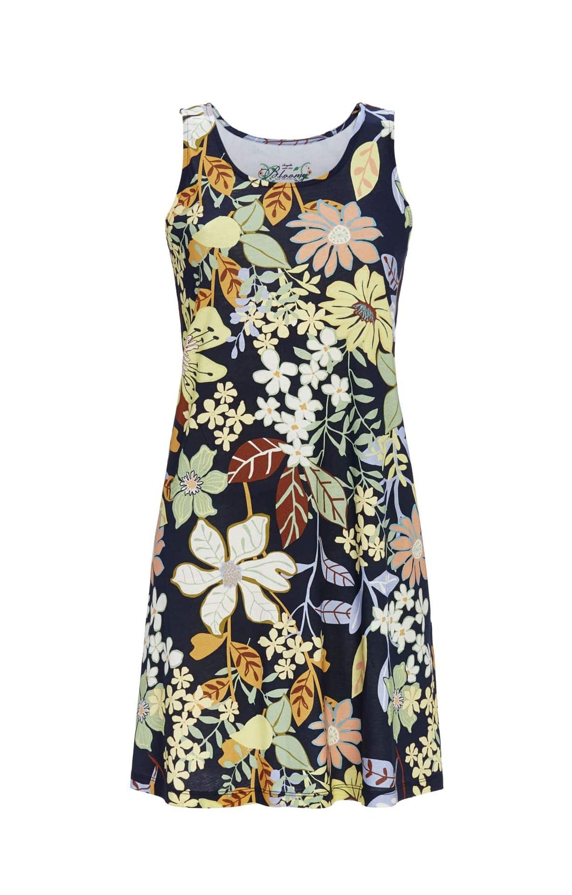 Dieses Kleid ist wirklich ein Blickfang mit seiner wunderschönen Blumenmusterung. Die lebendigen Farben lassen das Modell regelrecht strahlen. Es hat einen klassischen Rundhals-Ausschnitt und ist ärmellos, was es zu einem idealen Kleid für heiße Sommertage macht. Das Material, das aus einer Mischung von Baumwolle und Modal besteht, fühlt sich angenehm auf der Haut an und sorgt für eine brillante Farbwiedergabe.