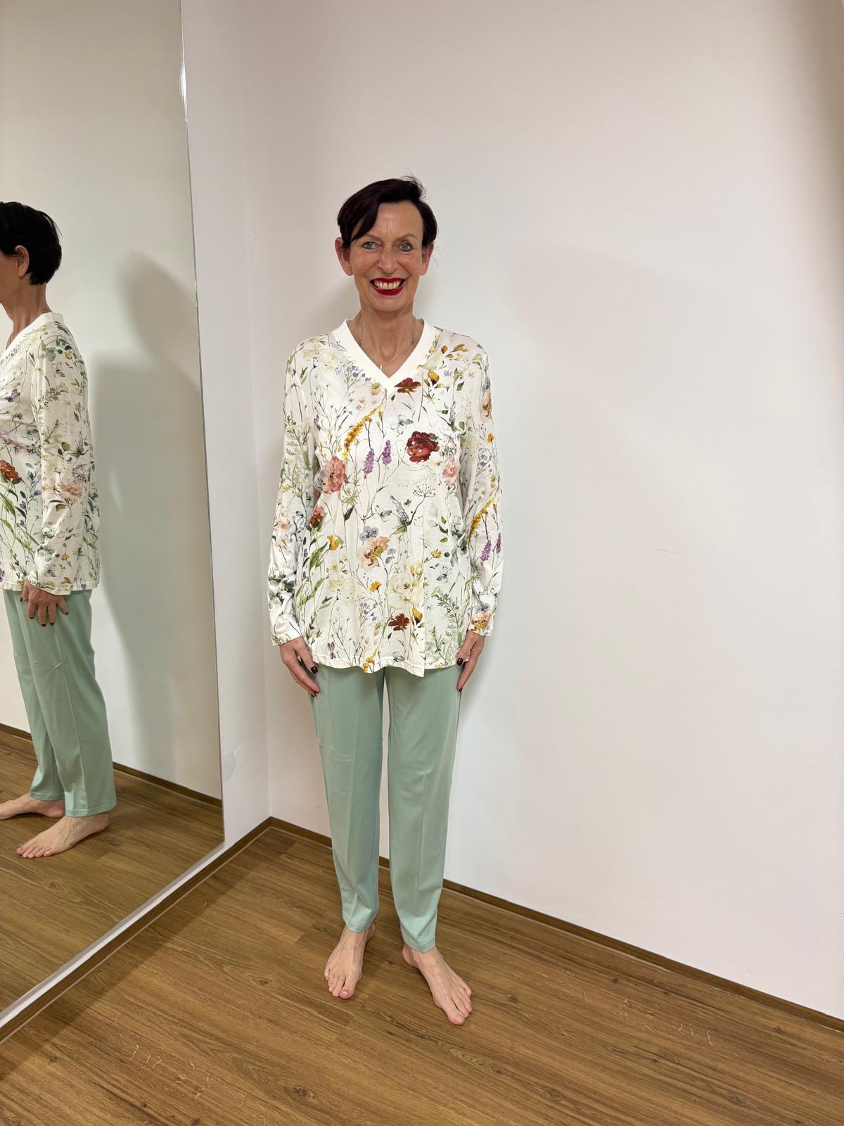 Dieses gemütliche Loungewear-Set vereint Komfort, Stil und Qualität. Das weiche, angenehm fließende Material fühlt sich besonders sanft auf der Haut an und sorgt den ganzen Tag für ein rundum wohliges Tragegefühl. Das blumige Oberteil verleiht dem Set eine moderne, feminine Note und macht es zu einem echten Wohlfühl-Liebling.